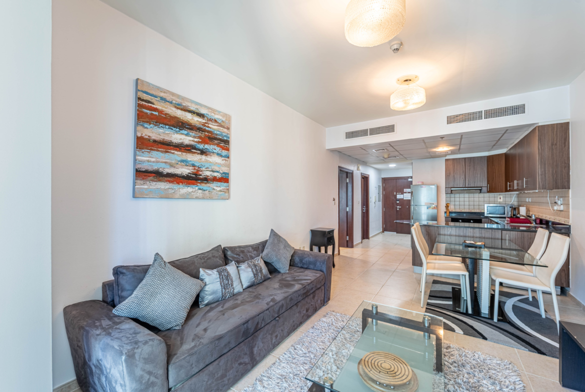 The apartment is fully furnished, and the kitchen is fully equipped. The unit has a decent size of 736.68 sqft a pleasant Skyline view and a bustling community view.